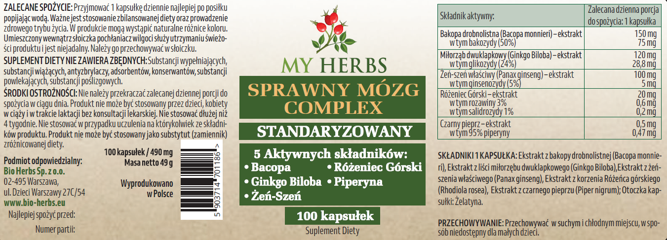 SPRAWNY MÓZG COMPLEX to suplement diety, którego składniki wspierają jak jego nazwa sama wskazuję mózg człowieka i to wszystko co z nim związane czyli pamięć, koncentrację, funkcję poznawcze czy zdolności psychiczne niezależnie od wieku czy kondycji naszego umysłu. Zawiera tylko i wyłącznie standaryzowane ekstrakty dzięki czemu mamy pewność jakości i składu naszego suplementu.
