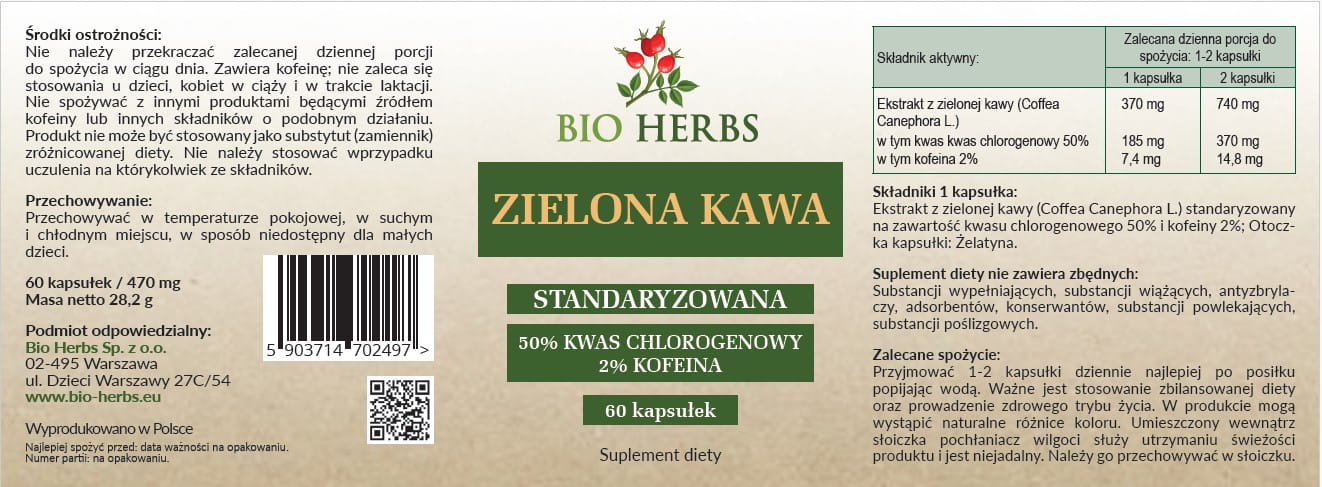ZIELONA KAWA STANDARYZOWANA 50% KWAS CHLOROGENOWY 60 KAPSUŁEK